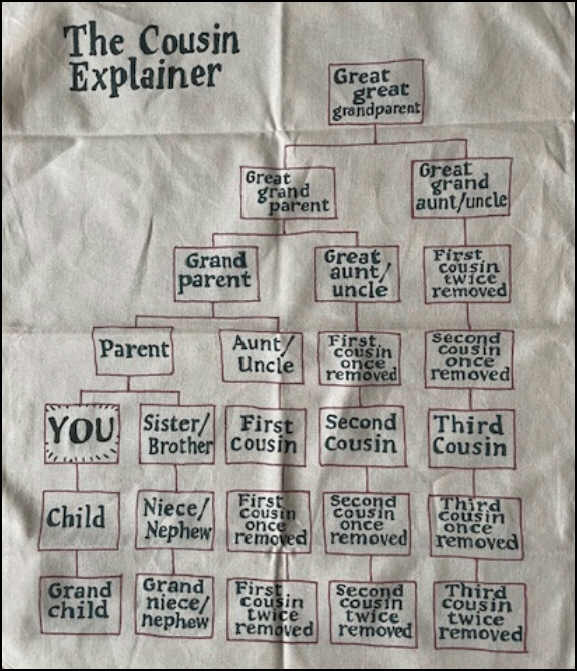 Your third cousin twice removed is the grandchild or grandparent parent of your third cousin...and so on.